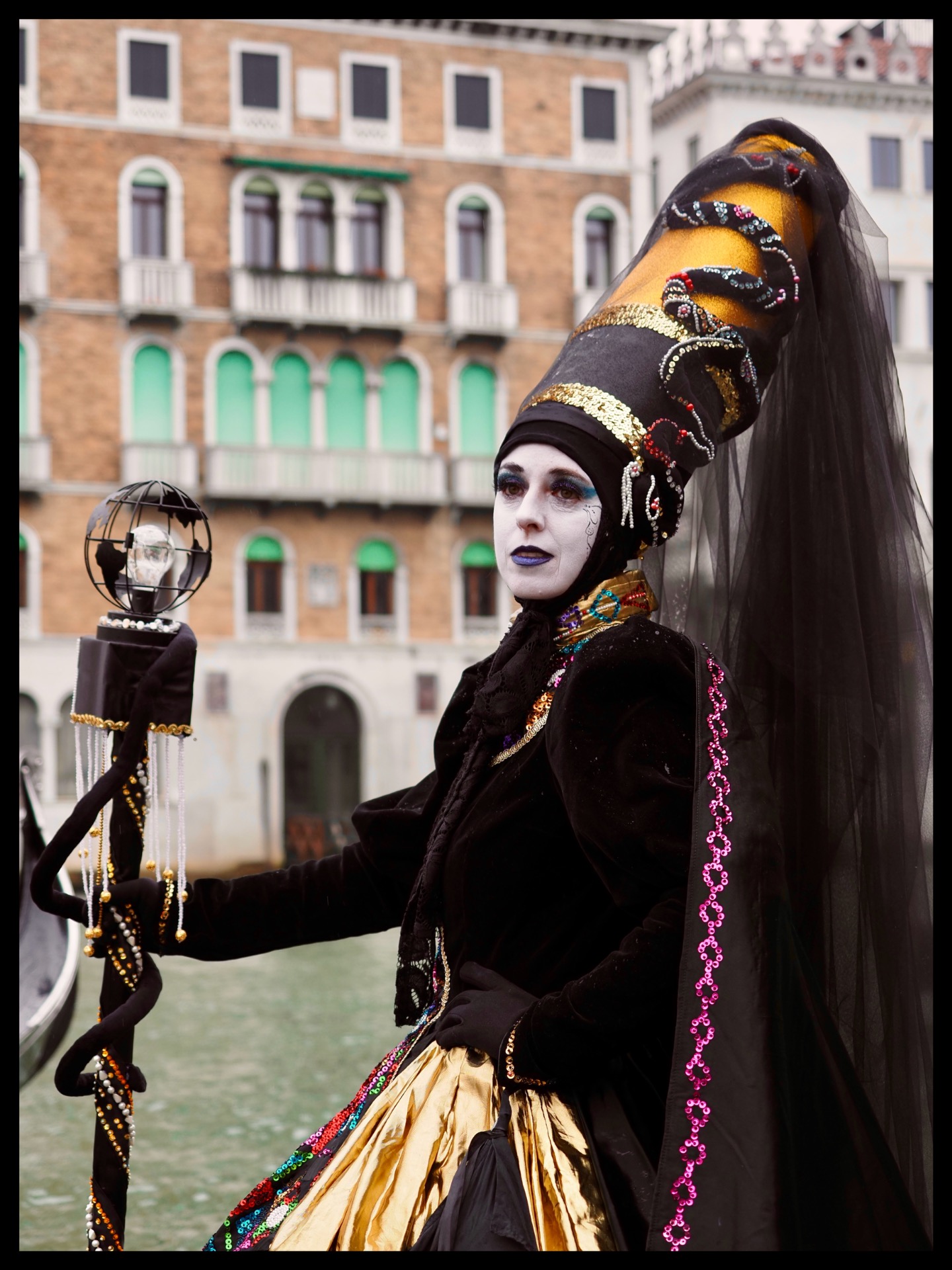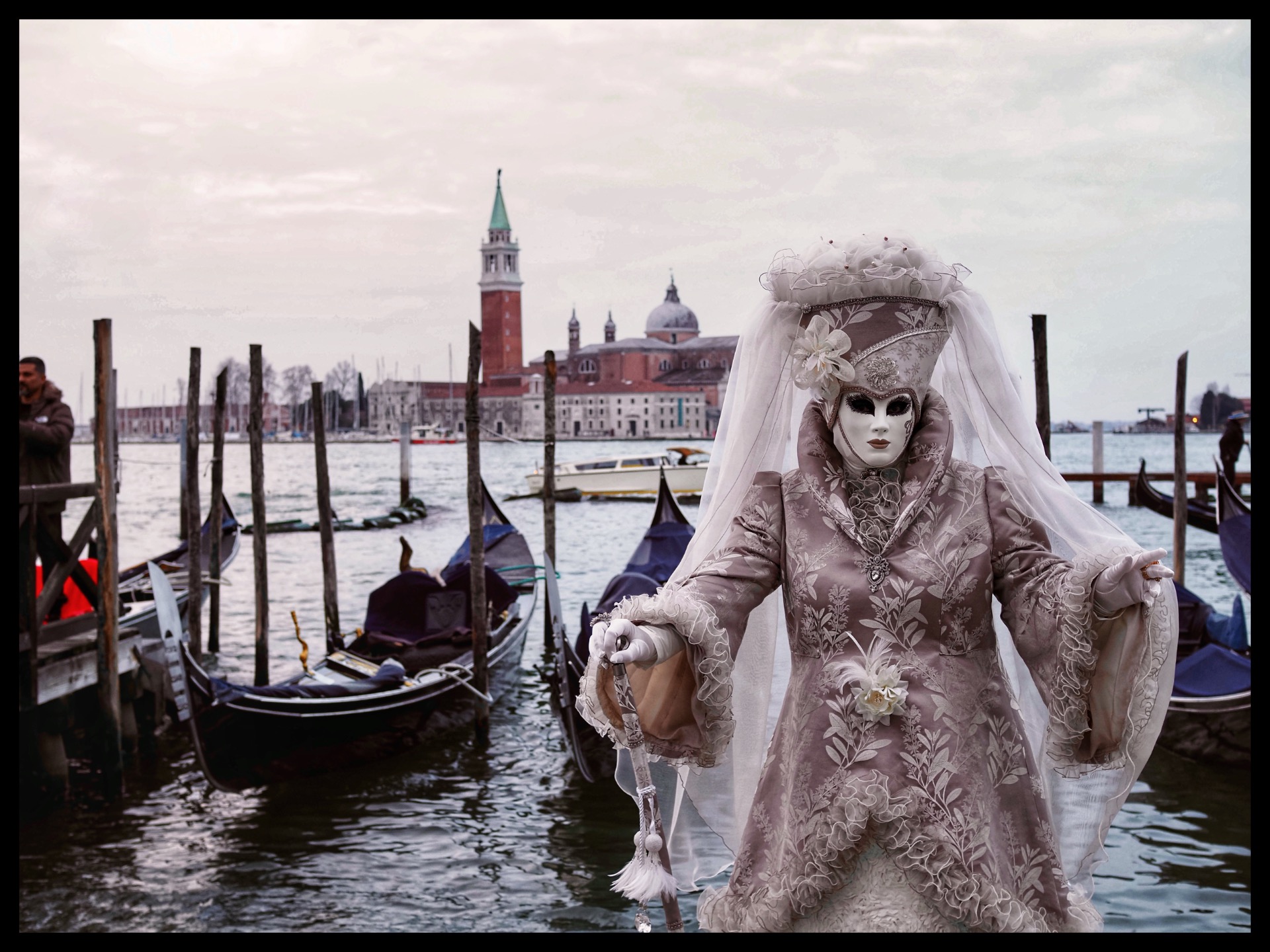 Beim Dogenpalast", auch "Palazzo Ducale" genannt, war schon etwas mehr los und um die verkleideten Menschen versammelten sich zahlreiche Fotografen. Fast alle ausgerüstet mit Blitz und Stativ. Ich natürlich nicht, trotzdem bekam ich ein paar Fotos hin. Danach ging ich an den Hafen und an anderen Stellen ans Wasser, versuchte dort ein paar Fotos mit den Gondeln einzufangen. Leider gab es keinen Nebel, sondern es regnete wieder. Also fing ich an, Masken und die Menschen, die dahinter stecken zu fotografieren. Alle hatten Talent sich in verschiedenen Posen zu zu zeigen und hatten daran auch Spaß.