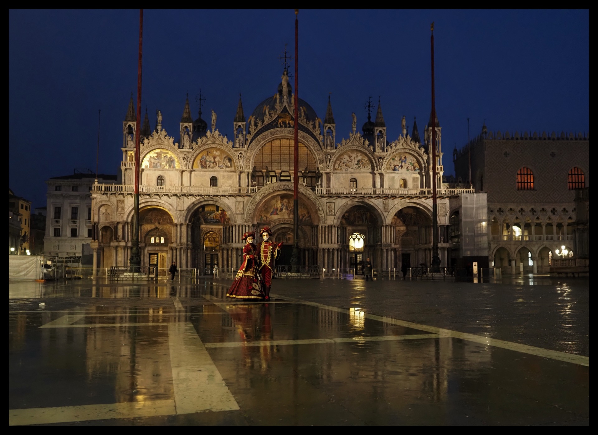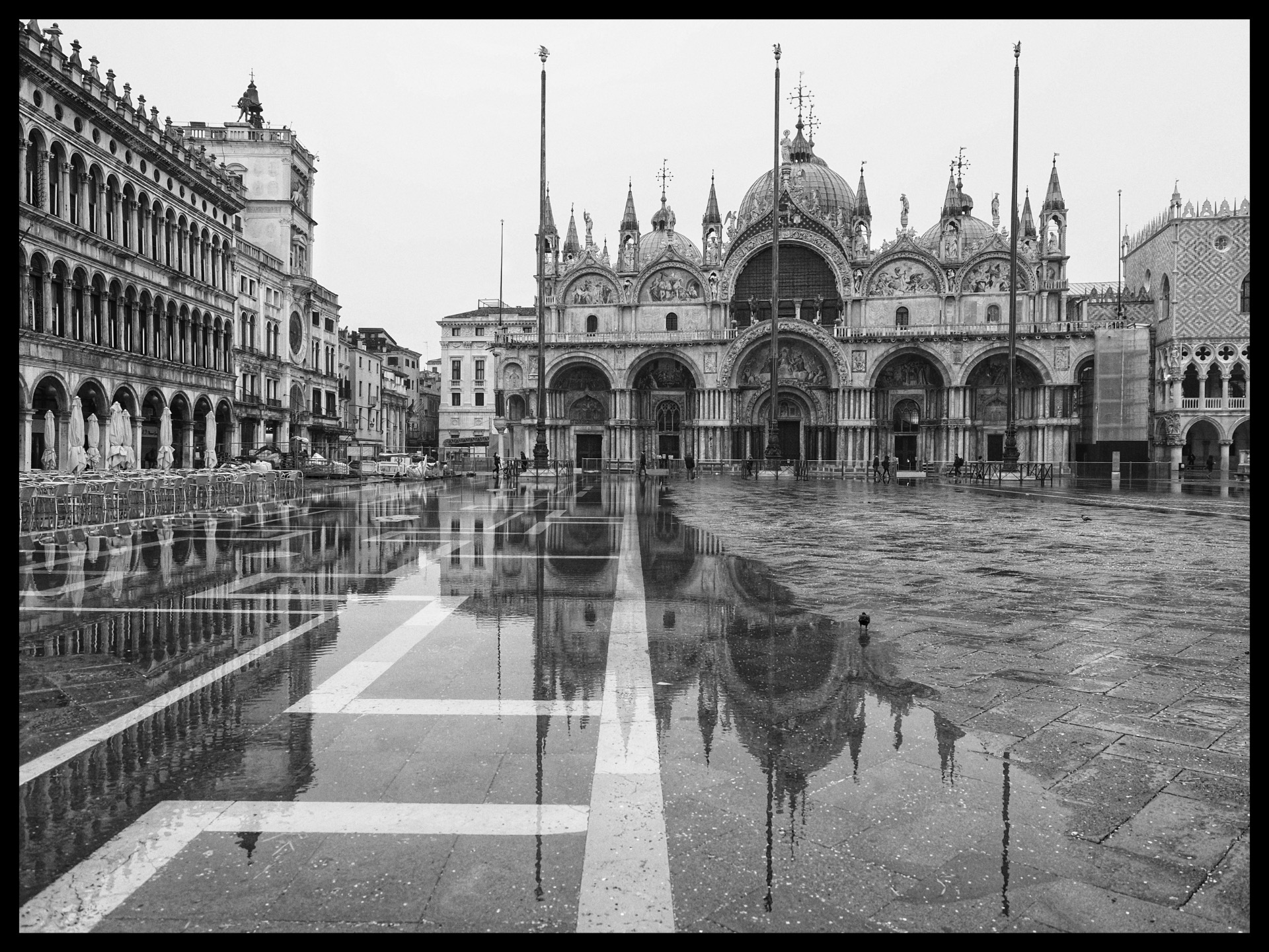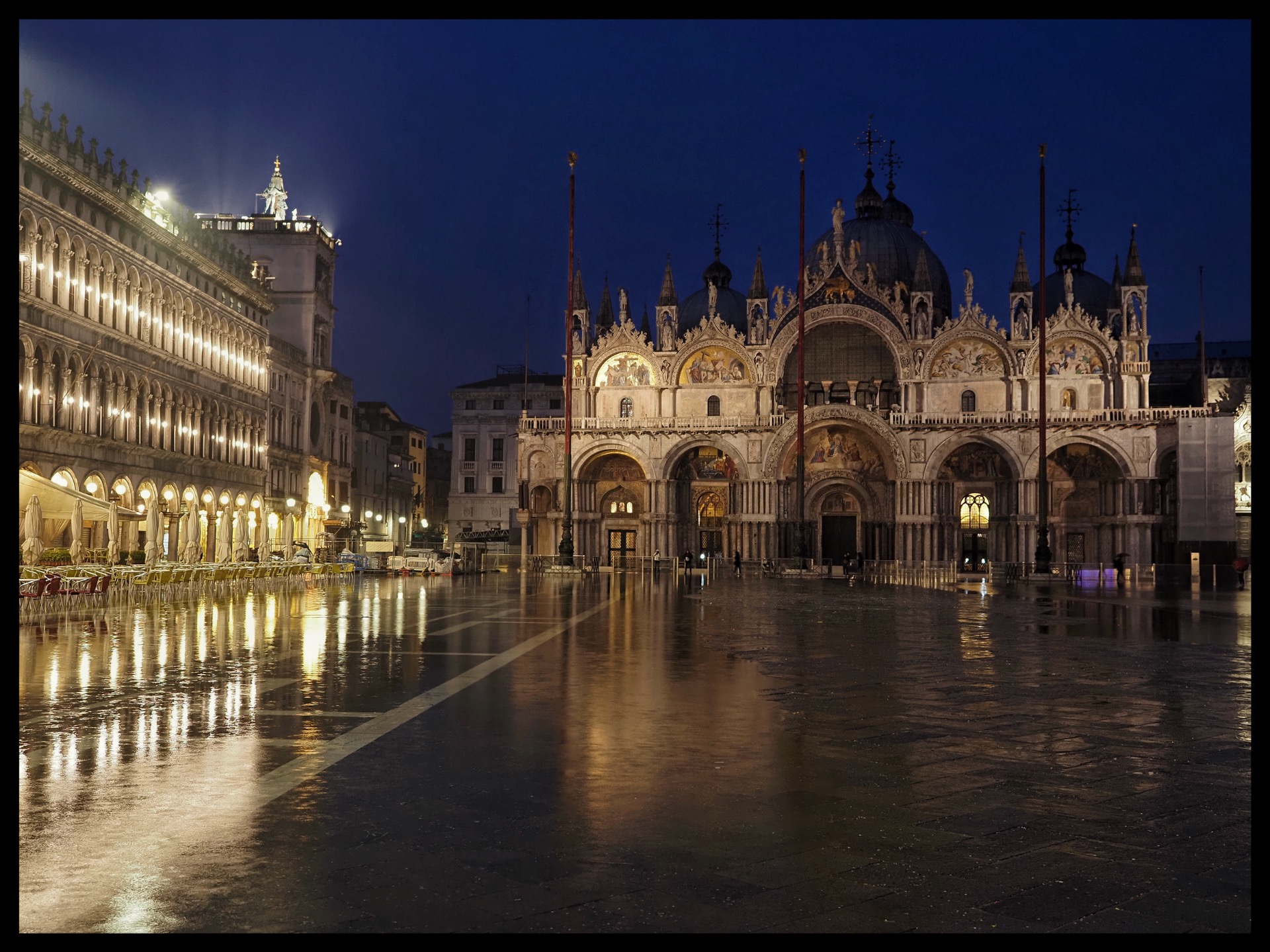 Noch vor dem Frühstück, bei Dunkelheit verließ ich das Hotel und machte mich auf in Richtung Markusplatz. Zum Glück war um diese Uhrzeit noch nichts los und ich konnte ein paar Aufnahmen zur blauen Stunde machen. Das Besondere daran war, dass es in der Nacht geregnet hatte und ich somit auch ein paar Spieglungen einfangen konnte. Nachteilig war, dass überall Wasser stand, sodass man nasse Füße bekam.