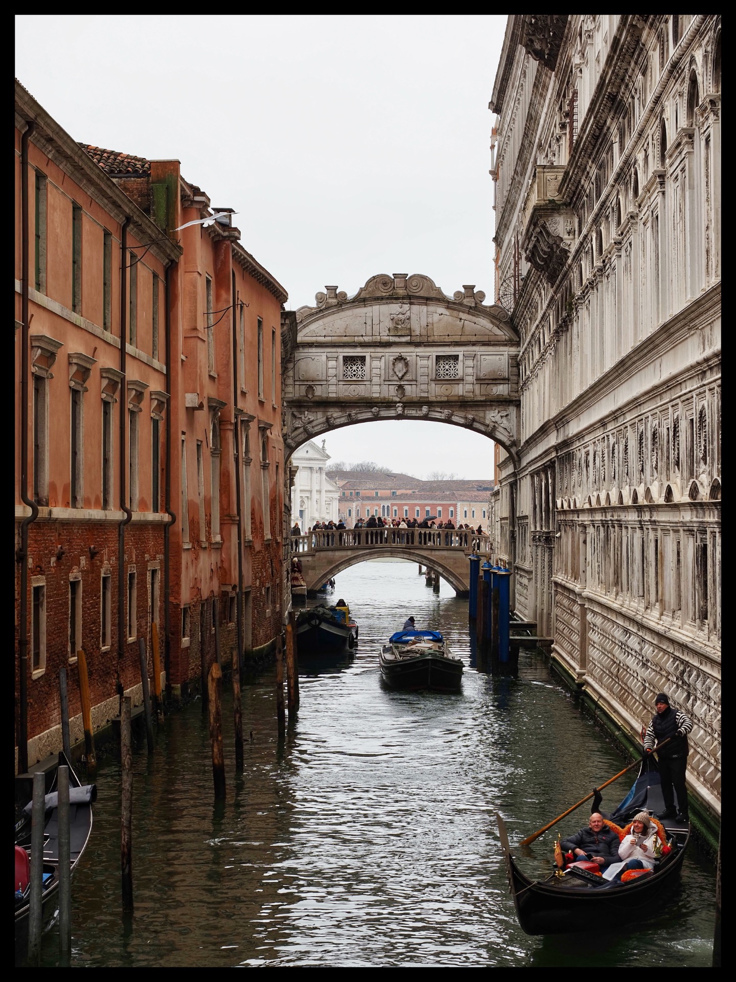 Mir fiel auf, dass auch einige professionelle Fotografen unterwegs waren. Lange hielt ich mich dort nicht auf, denn ich wollte zur "Calle Contarini del Bovolo". Er ist ein gotischer Palast im Stadtviertel San Marco in der Nähe des Campo Manin. Doch als ich dort ankam, war leider schon geschlossen. Also spazierte ich weiter durch die Gassen, bis ich zur "Ponte della Paglia"und dem Hafen kam. Dort wurde auch wieder fleißig gepost und fotografiert.