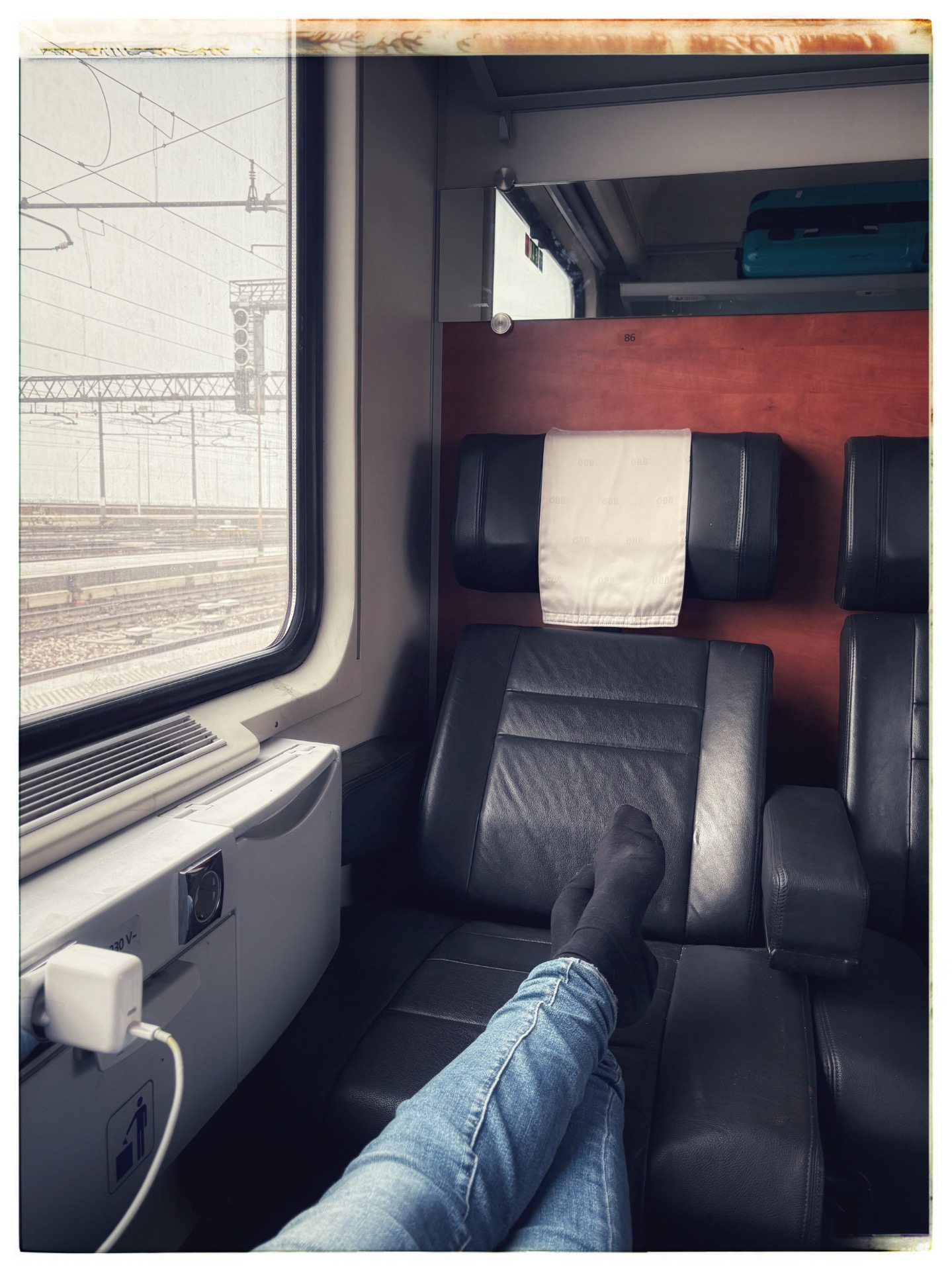Am frühen Morgen fuhr ich mit dem Regionalzug zum Hauptbahnhof. Dort stieg ich in den Eurocity nach Venedig um, der bereits auf Gleis 12 wartete und suchte meinen reservierten Sitzplatz in der ersten Klasse. Leider konnte ich im Vorfeld nicht selbst wählen, ob ich einen Fensterplatz und in Fahrtrichtung wählen. Und natürlich bekam ich genau das Gegenteil zugeteilt. In meinem Abteil waren noch drei weitere Fahrgäste. Ich wartete bis der Zug losfuhr, schaute mich dann in Ruhe nochmal in der ersten Klasse um und fand ein Abteil ohne Reservierungen. Ich zog um und hatte schließlich doch einen Fensterplatz in Fahrtrichtung. Über Rosenheim, ein paar Stationen in Österreich fuhr der Zug nach Italien. Eine herrliche Kulisse zeigt der Blick aus dem Fenster, wenn man durch die Alpen fährt. Ich genoss die siebeneineinhalb Stunden in meinem Abteil ganz alleine, schaute Filme, schlief etwas und schaute mir immer wieder die vorbeiziehende Landschaft an. Mit leichter Verspätung erreichte der Zug Venedig.
