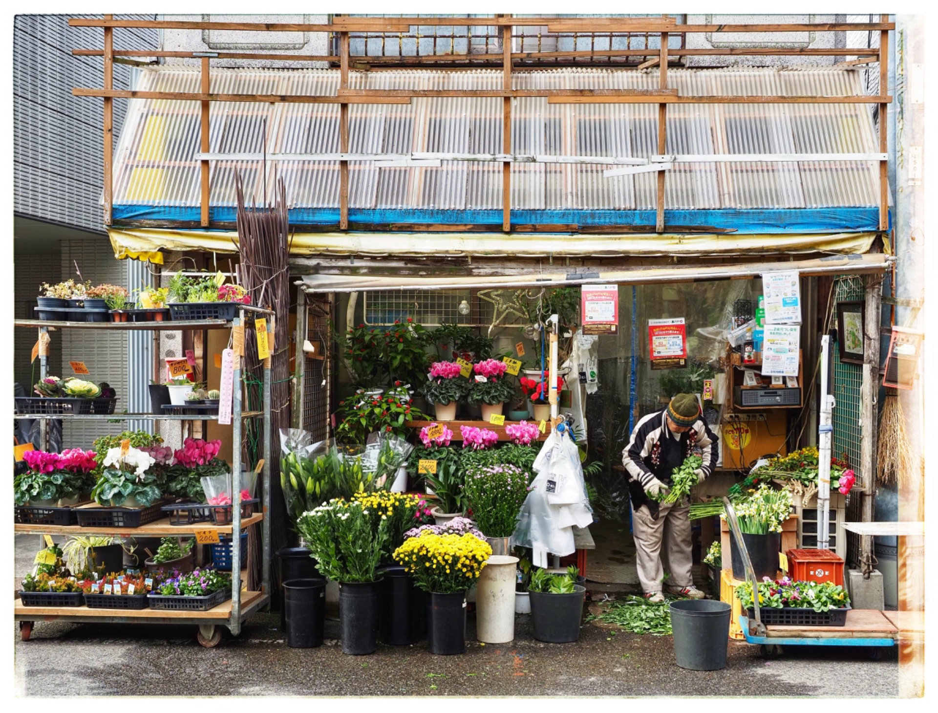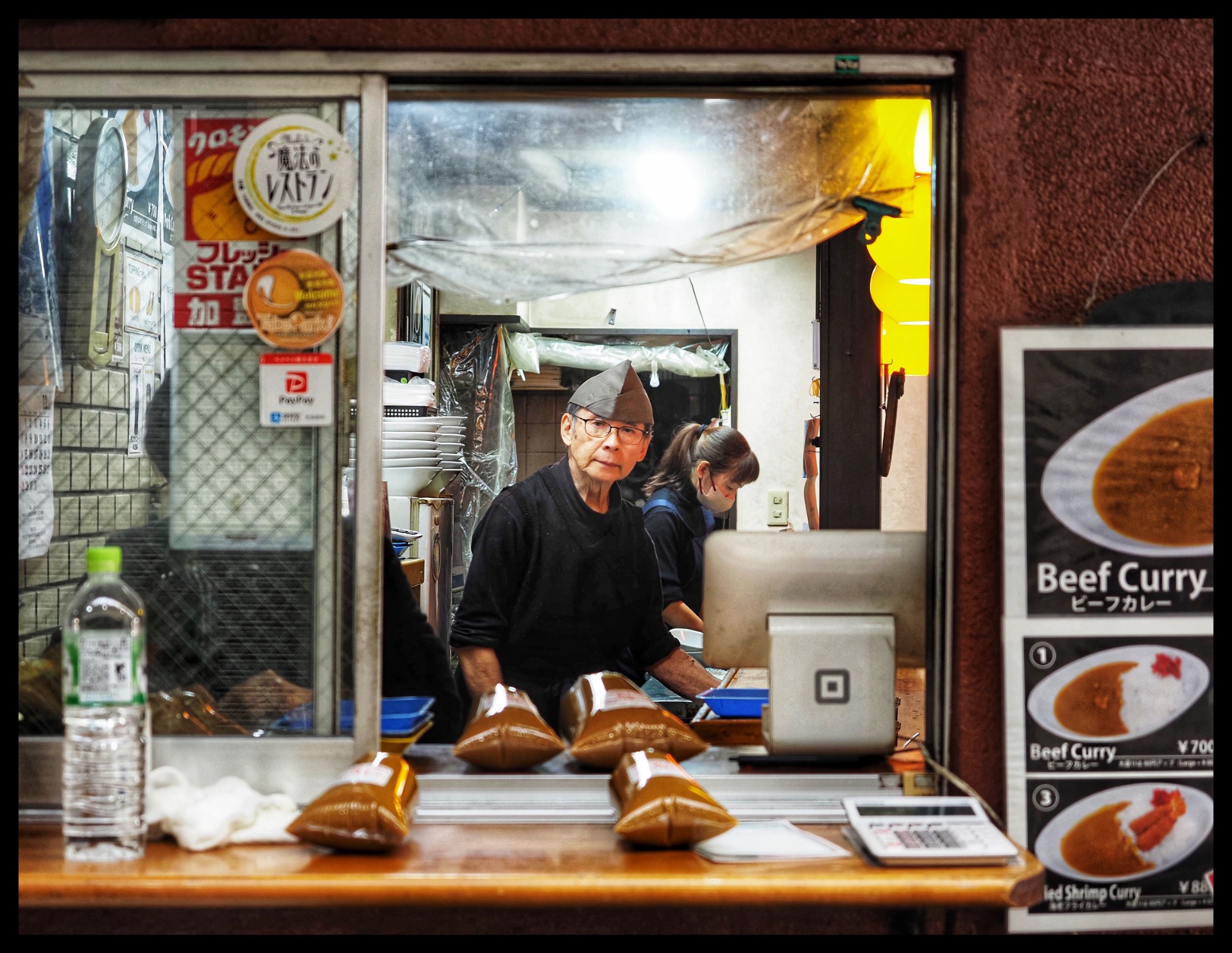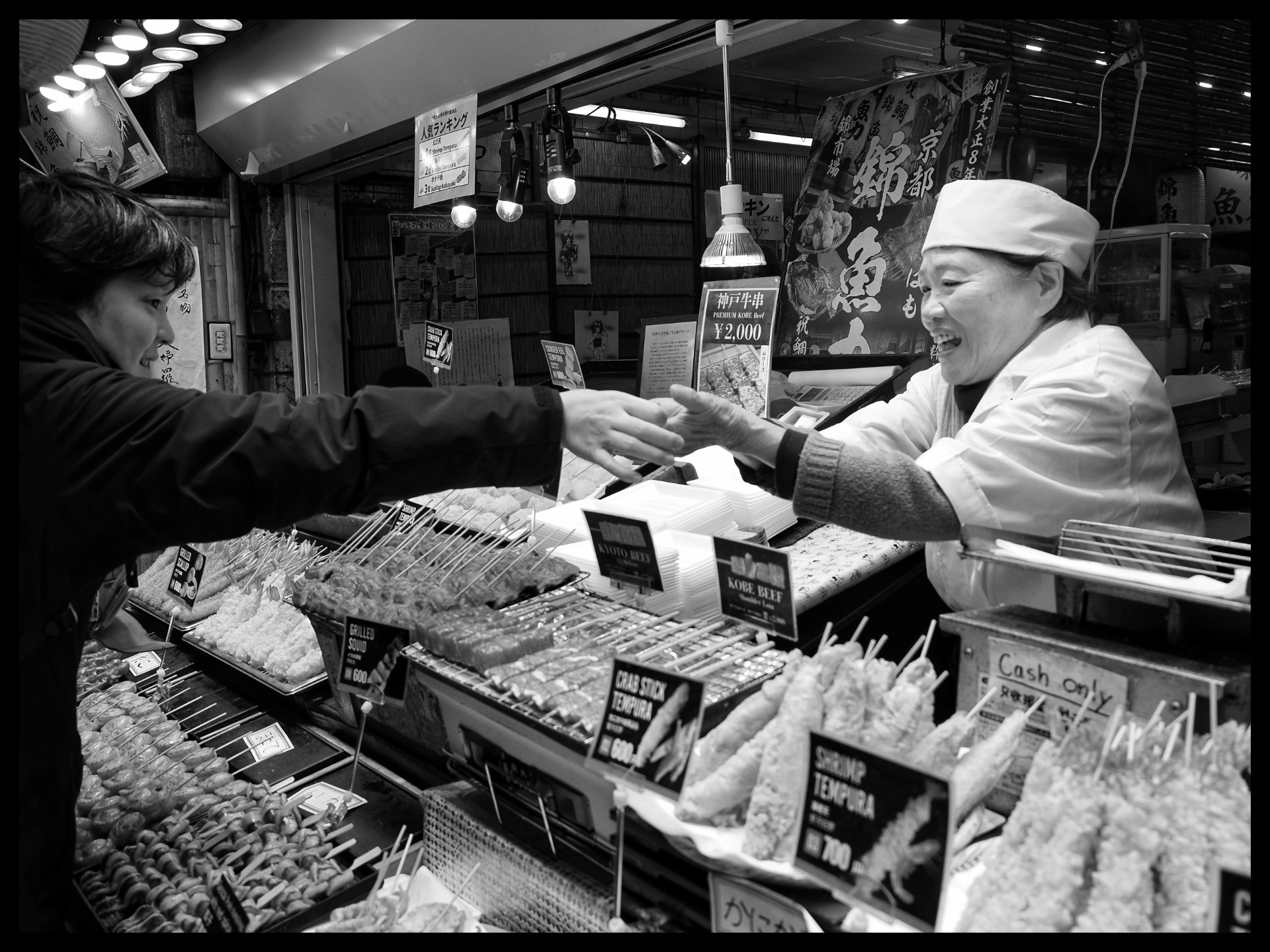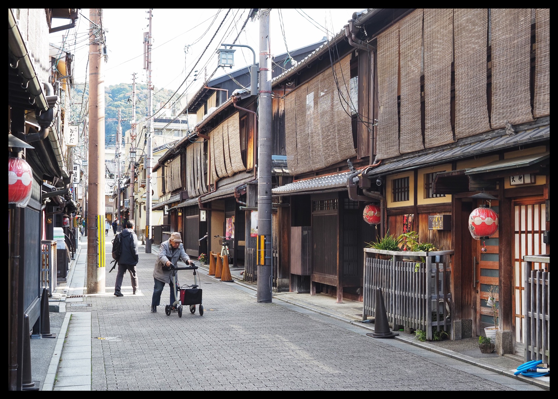 Back at the hotel, I changed from my wet clothes into dry ones and set off. I wanted to do some shopping and take some photos. But there wasn't much to see. So I decided to walk to the Higashi Chaya District. There I entered a small shop. The two owners were very friendly and allowed me to take photos of them at work, sewing and cooking.