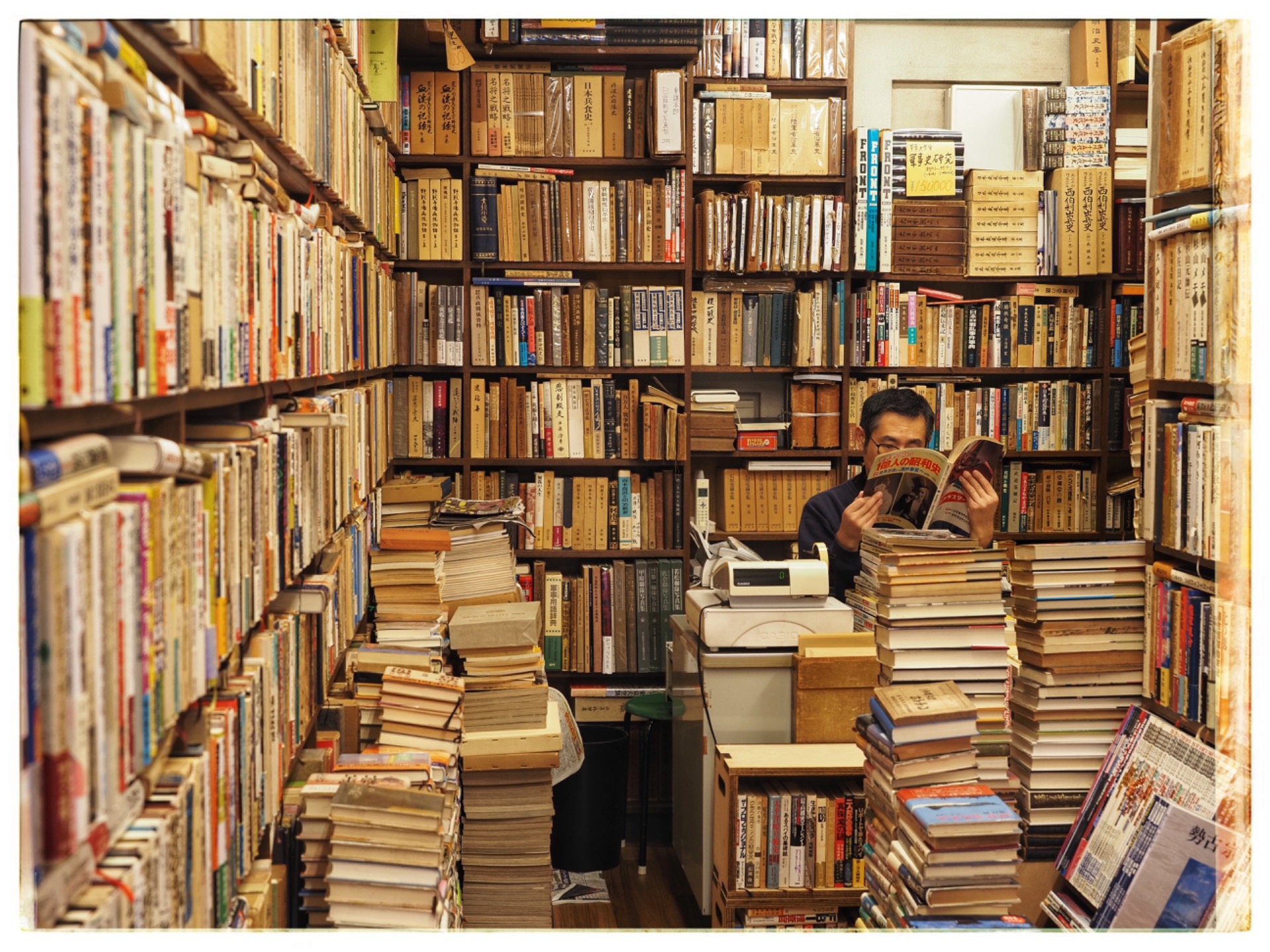 So I took the train to the next neighbourhood, Akihabara Ochanomizu. There are over 130 second-hand bookshops in the Kanda Jinbocho Street area. Even though I can't read a single book, I set off because I already had certain images in my head that I wanted to capture photographically. Most shops don't allow photography, but it was permitted from outside, and a friendly sales assistant allowed me to photograph his shop after all. There are also book cafés and book hotels in this area. Everything revolves around books there. This part of Tokyo is definitely worth seeing.