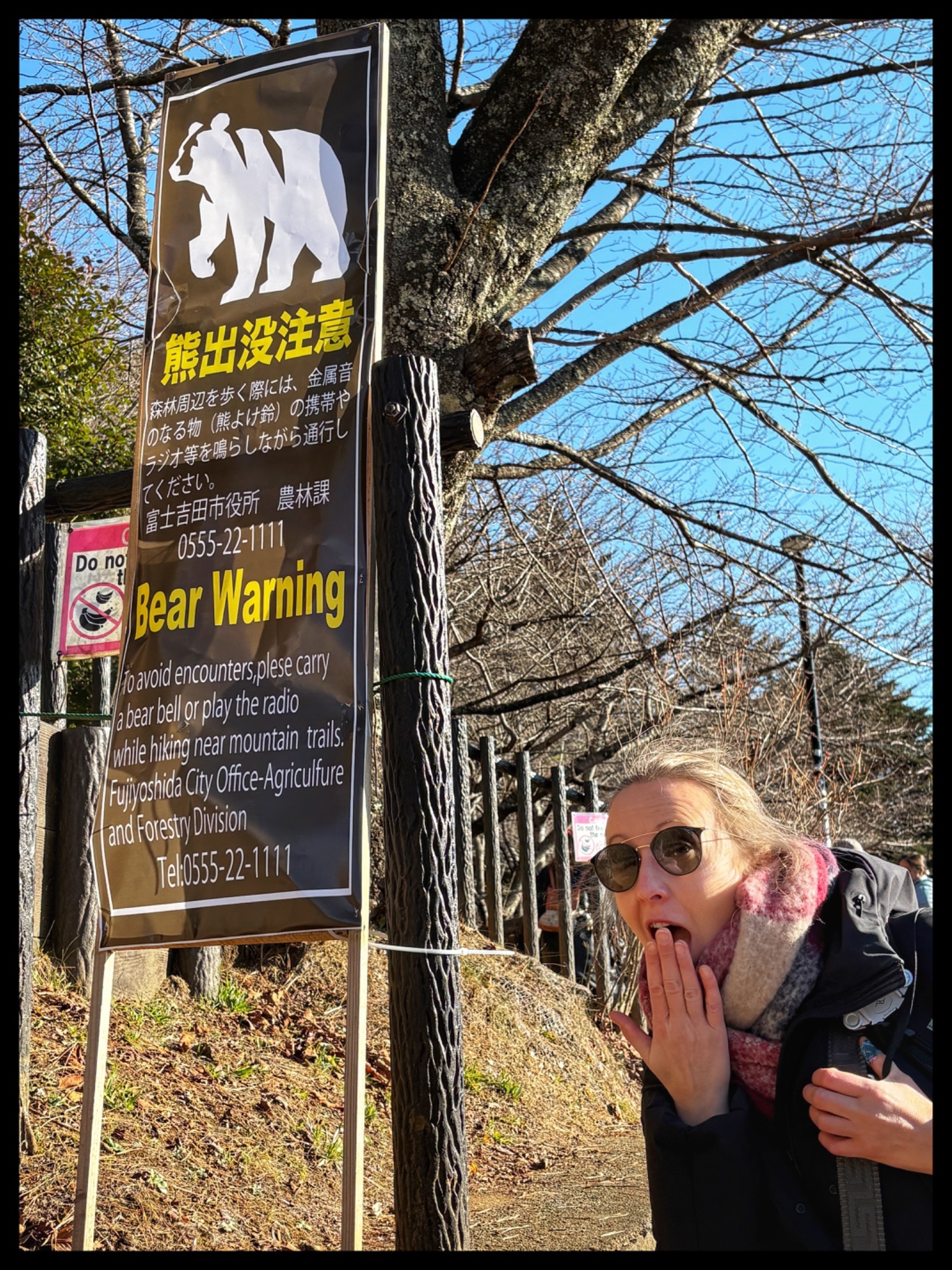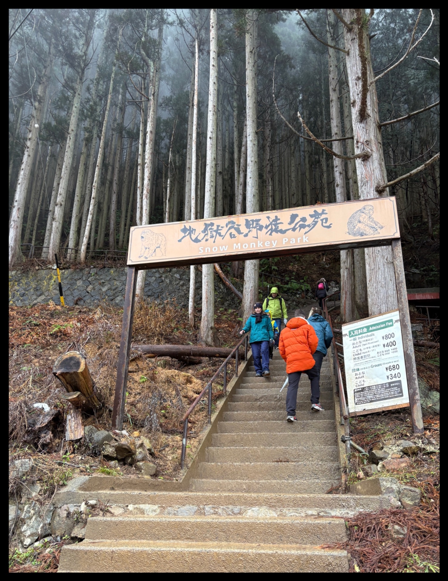 After 45 minutes, we reached the bus stop for Snow Monkey Park. From there, you have to climb almost two kilometres up into the mountains to reach the hot springs. The path was a bit steep at first. If there is black ice or snow, you should be especially careful here and wear good footwear. The rest of the path was just muddy because it kept raining. I had prepared myself for snow, but oh well. In the past, snow was guaranteed in December. Unfortunately, that is no longer the case today. Climate change is also noticeable here.