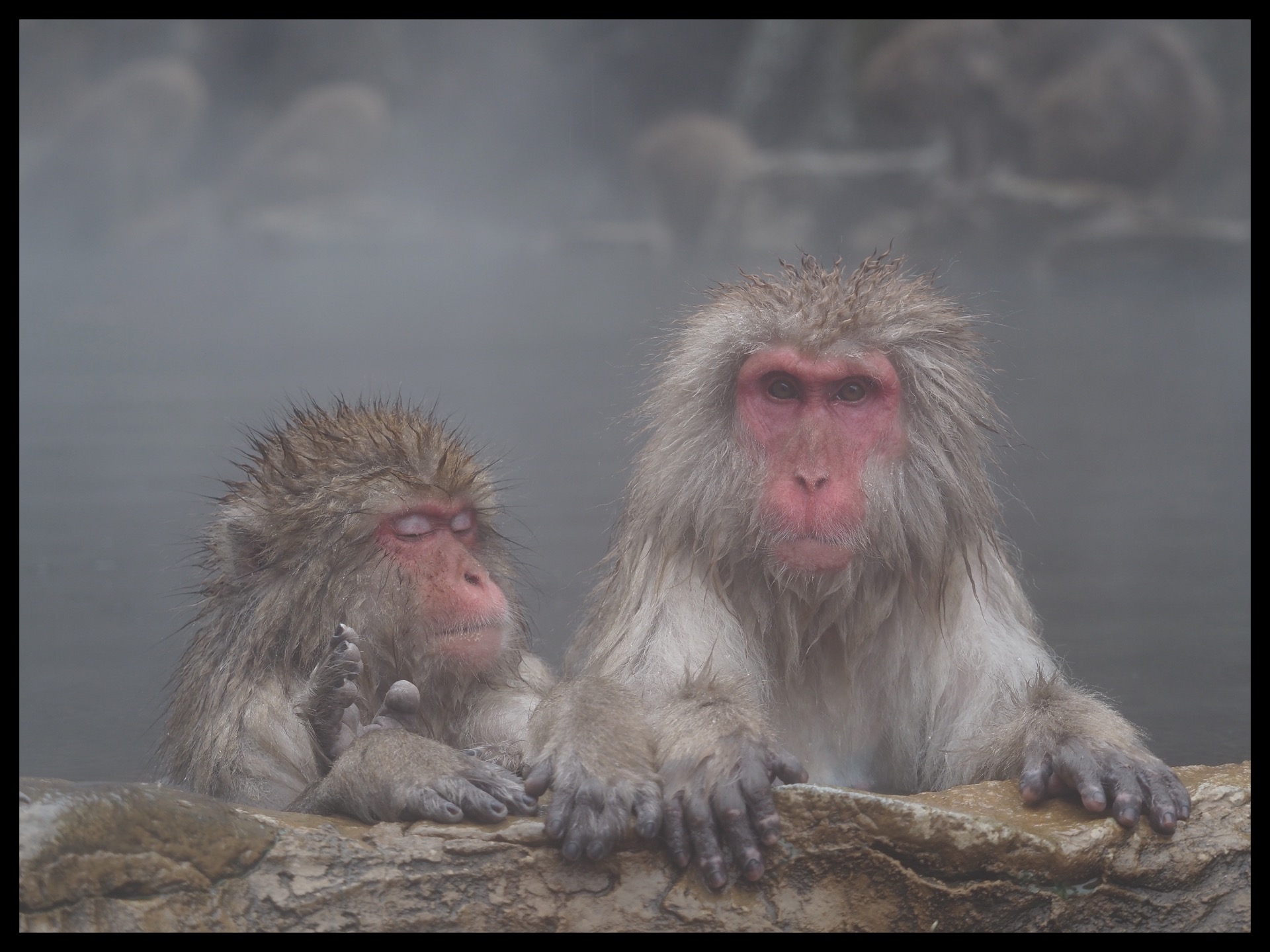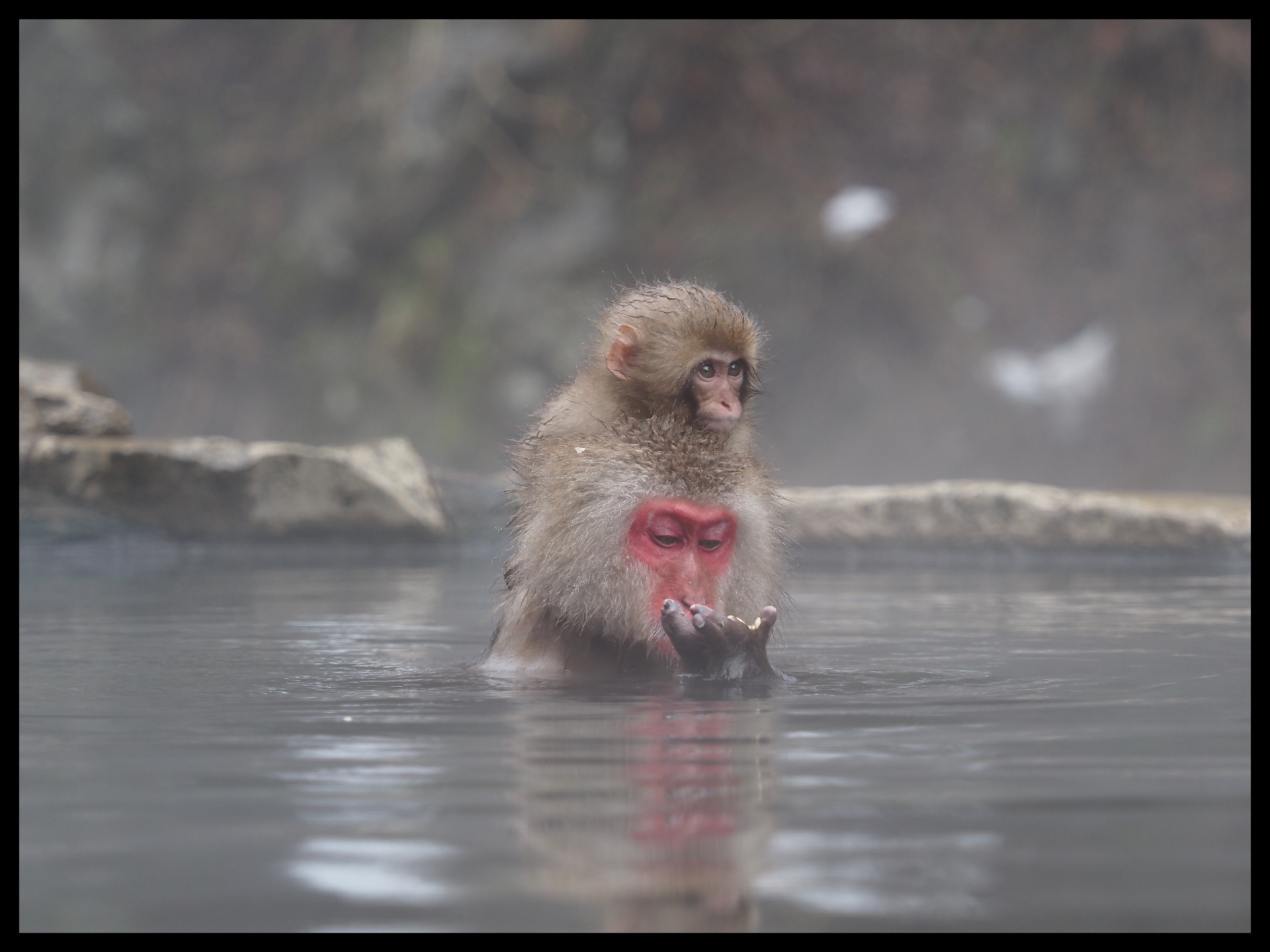 And there they were: monkeys everywhere. They came from all sides and you could already see the steam from the springs. There was also a little snow. Unfortunately, there were already quite a few people at the hot springs. But I was lucky and managed to find a good spot to take photos. It was impressive how the monkeys ignored us humans and paid no attention to us at all. They quarrelled, made love, chilled out and bathed in the water. The onset of rain gave me a different kind of photo opportunity, and the steam from the warm water added that special something. So I got some interesting photos, even without snow. Luckily, I had my rain cape with me and put it on so I didn't get completely soaked.