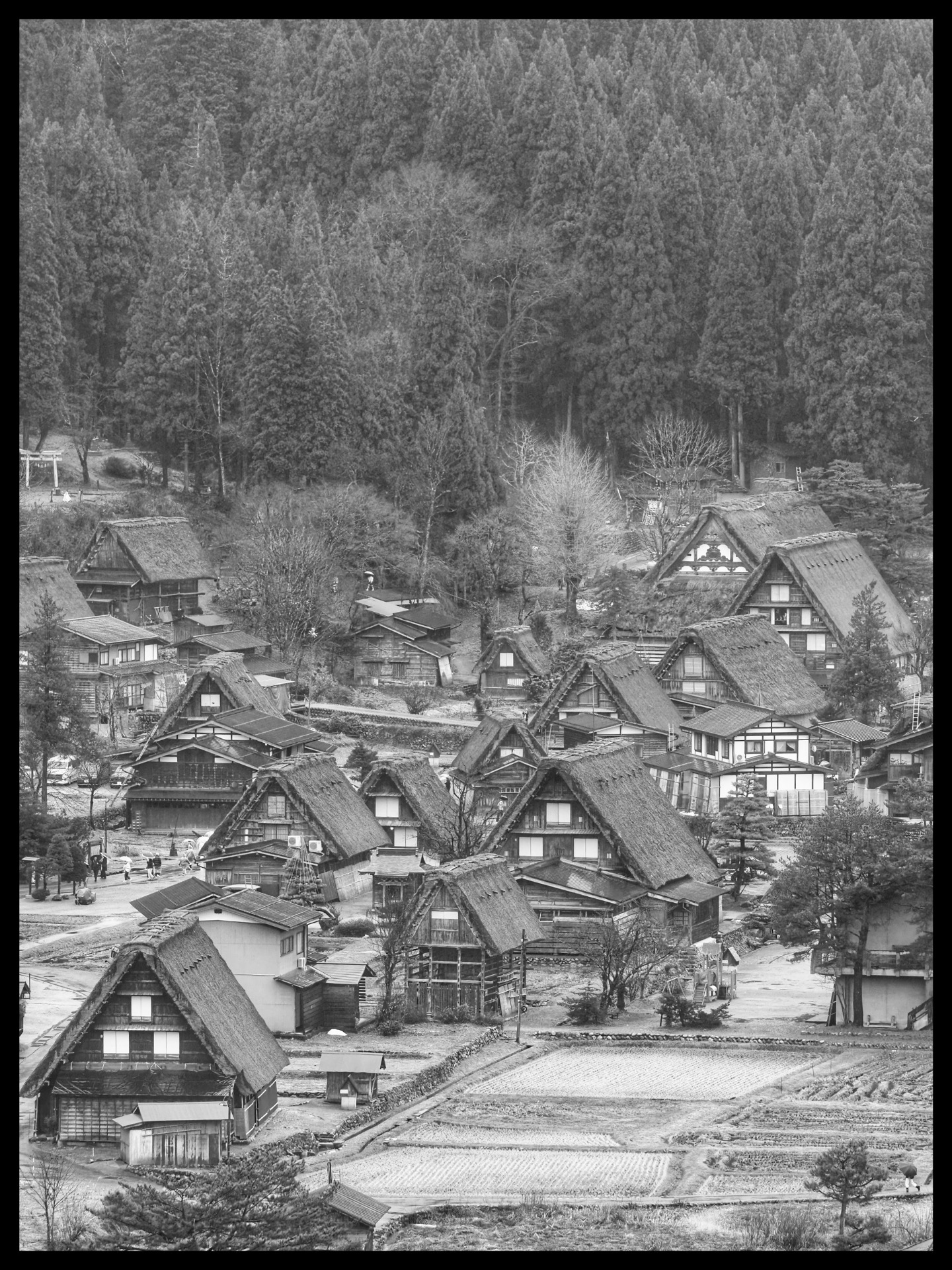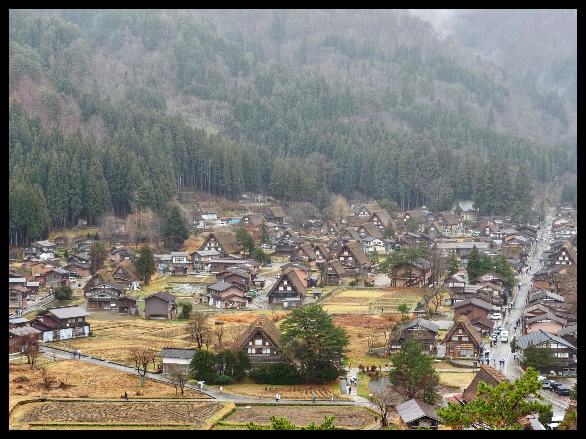 It was pouring with rain, and it was foggy and cold. I first climbed up to the viewpoint to capture the beautiful village with its traditional houses and roofs in a slightly foggy atmosphere. From up there, you had a beautiful view. Here, too, I had hoped for snow, but no such luck. However, the rainy and foggy weather also had something special about it.