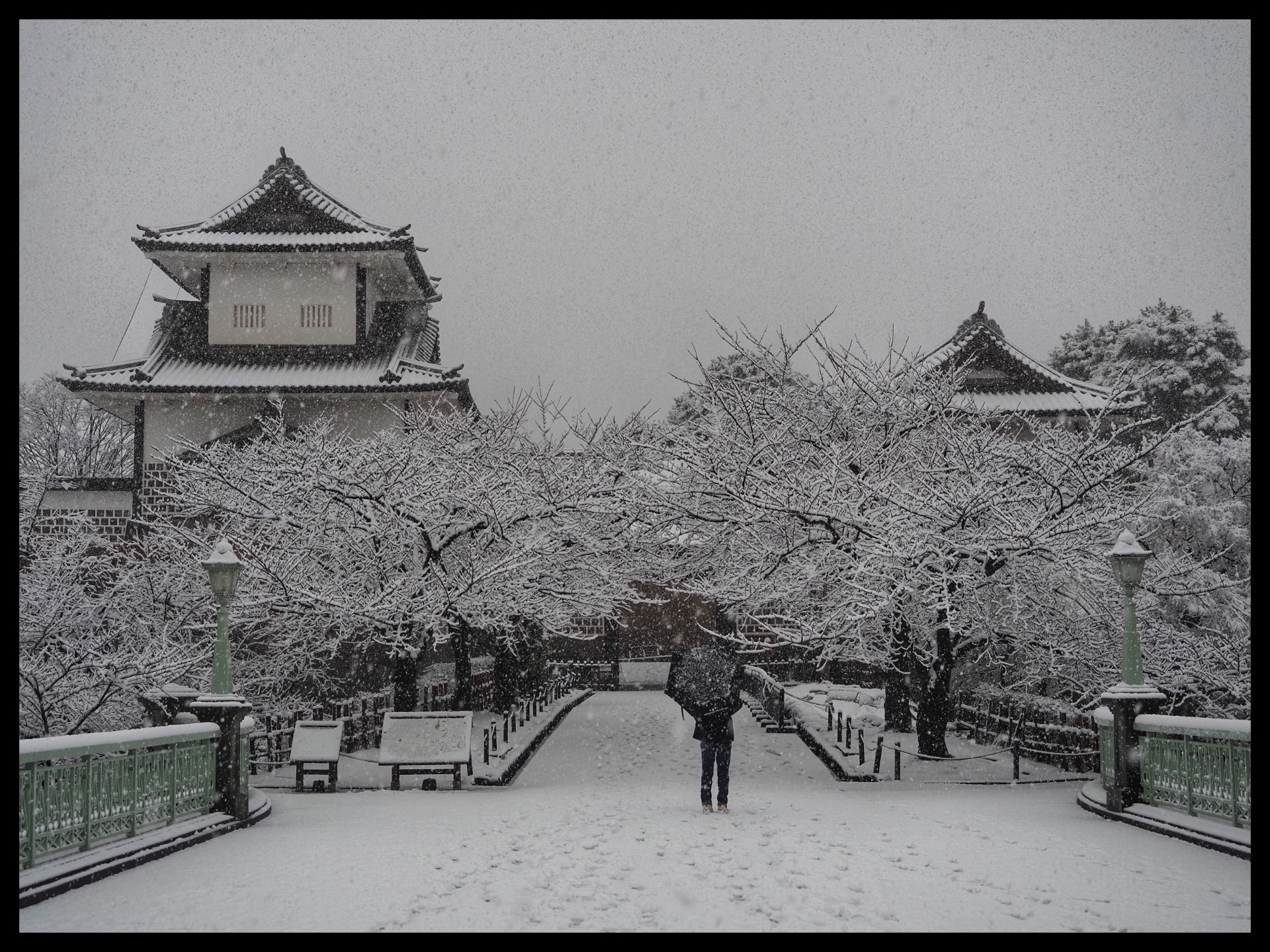 Afterwards, I walked to Kanazawa Castle. However, I couldn't see much because of the heavy snow shower. There was hardly anyone around. Sometimes I get the feeling that Japanese cities only wake up at 10 a.m. Admission is not possible before 9 or 10 a.m. either.