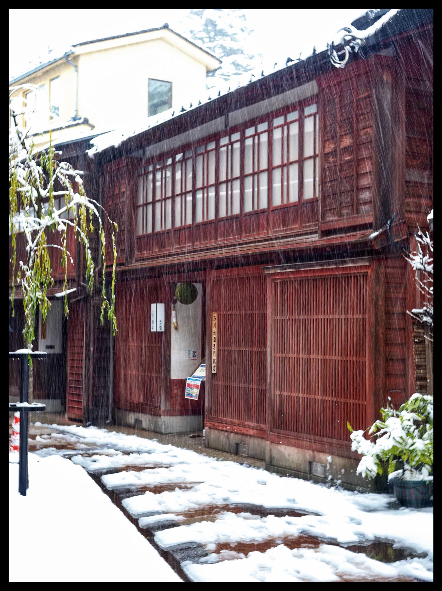 I had to pay an entrance fee of around €1.50 for Kenroku-en Garden. It was beautifully laid out, but there wasn't much to photograph in the snow shower, so I took the bus back to the Higashi Chaya district.