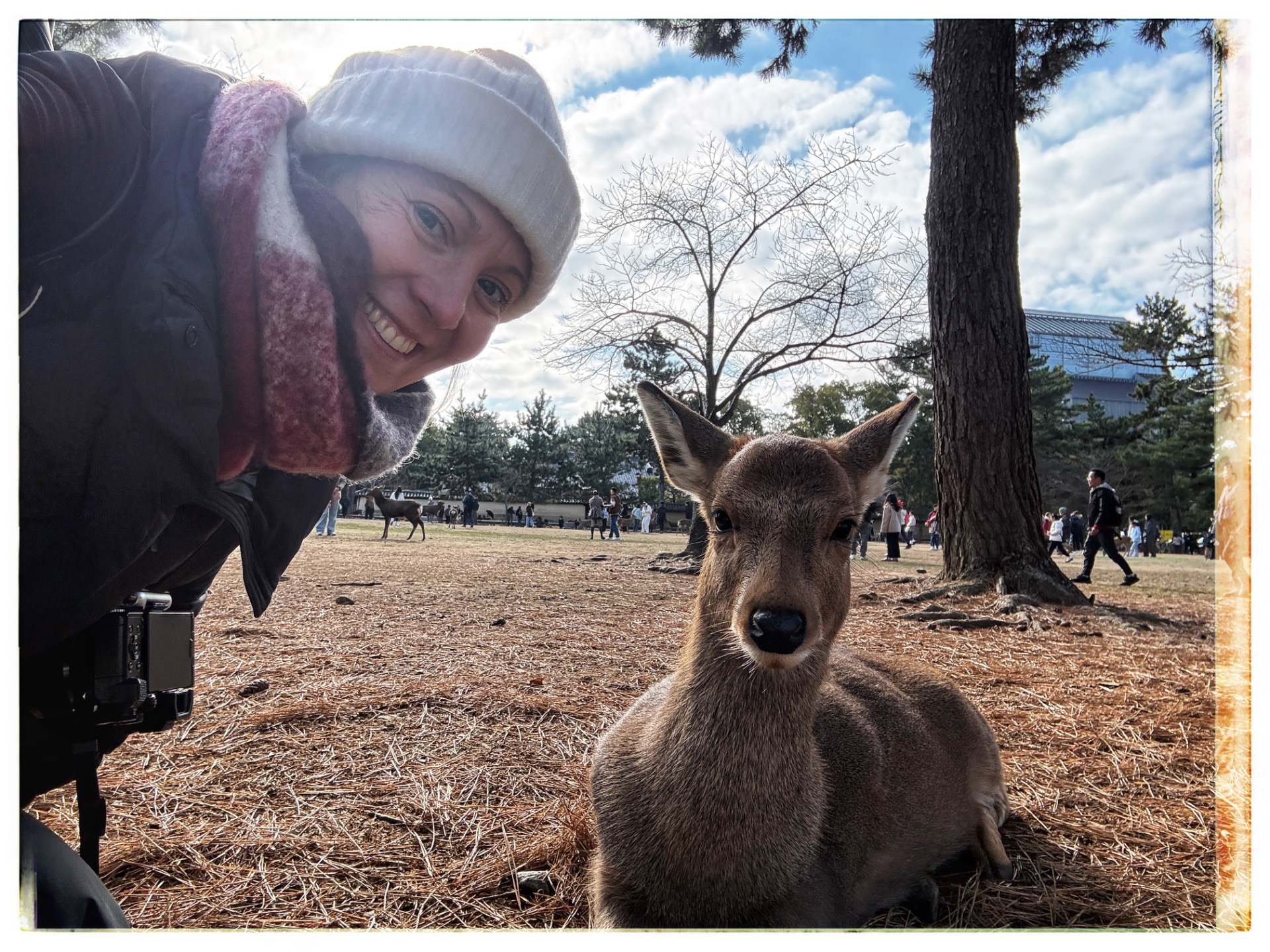 Feeling somewhat refreshed, I set off for Nara Park. It is famous for its sika deer, which roam freely, crossing zebra crossings and roads. Drivers are used to this, and there are signs everywhere saying 'Beware of deer'. It was impressive; they were not shy at all, neither of cars nor of people.