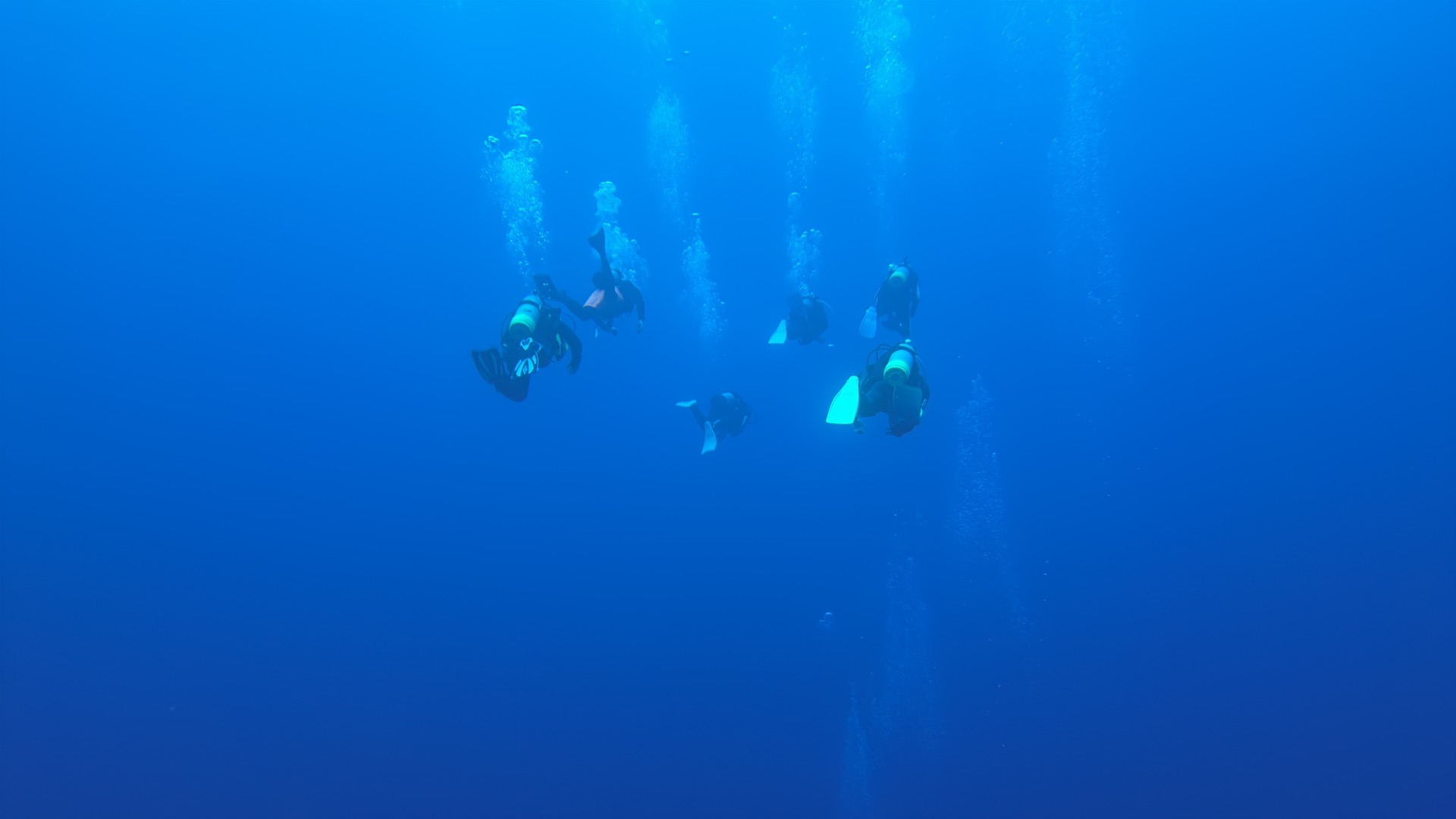 But for a long time, nothing could be seen on the sonar images. Then we located a large group of hammerhead sharks, unfortunately at a depth of 60 meters. We watched them on the sonar screens, and as they moved higher, we got ready and descended. At first, however, it looked like it would just be a blue-water dive. Just as we were about to head toward the safety stop, Riku finally spotted a few—though they were at 30 meters already and in the process of descending again. I could only make out a shadow; a few fellow divers managed to capture them on video.