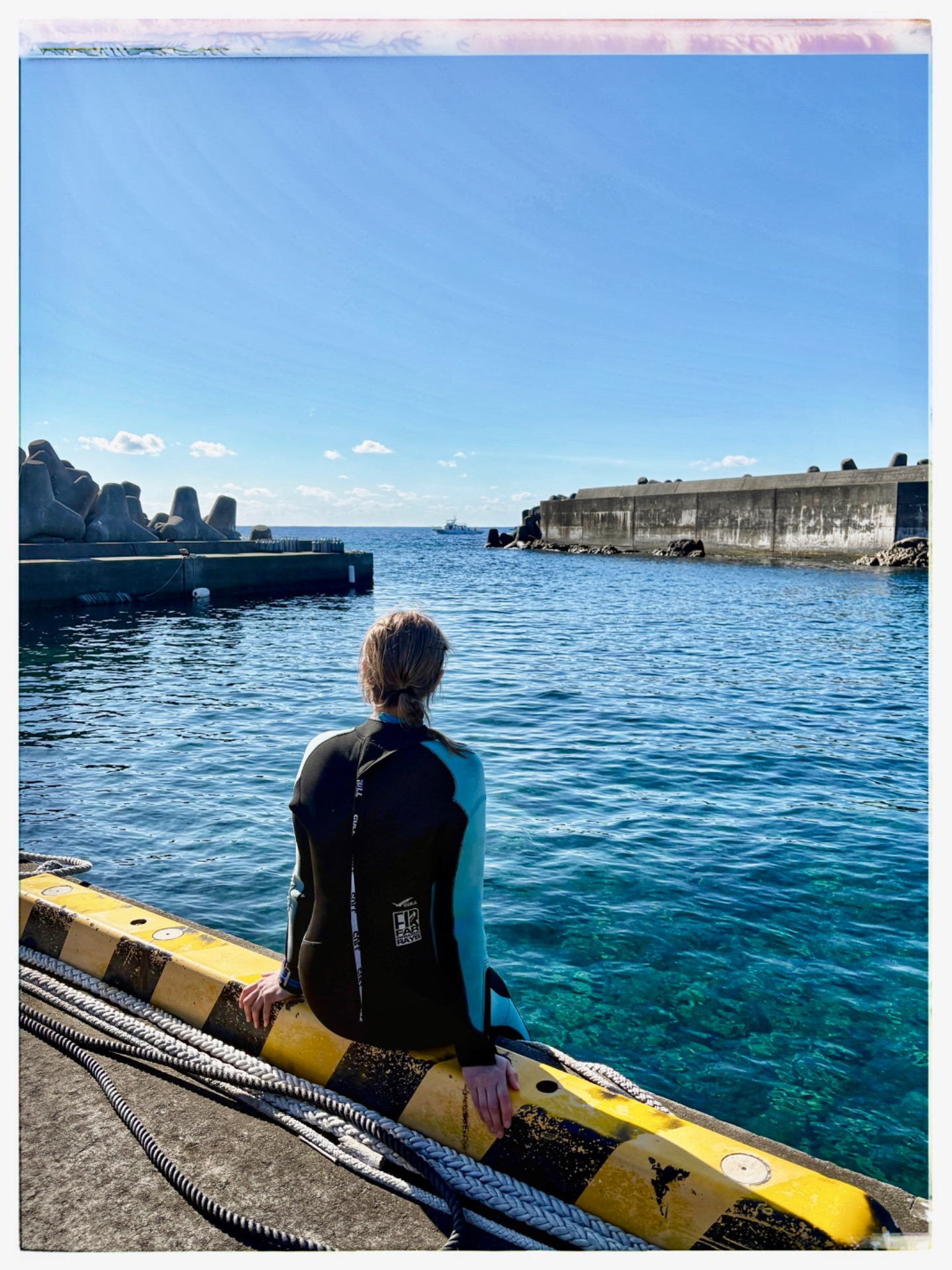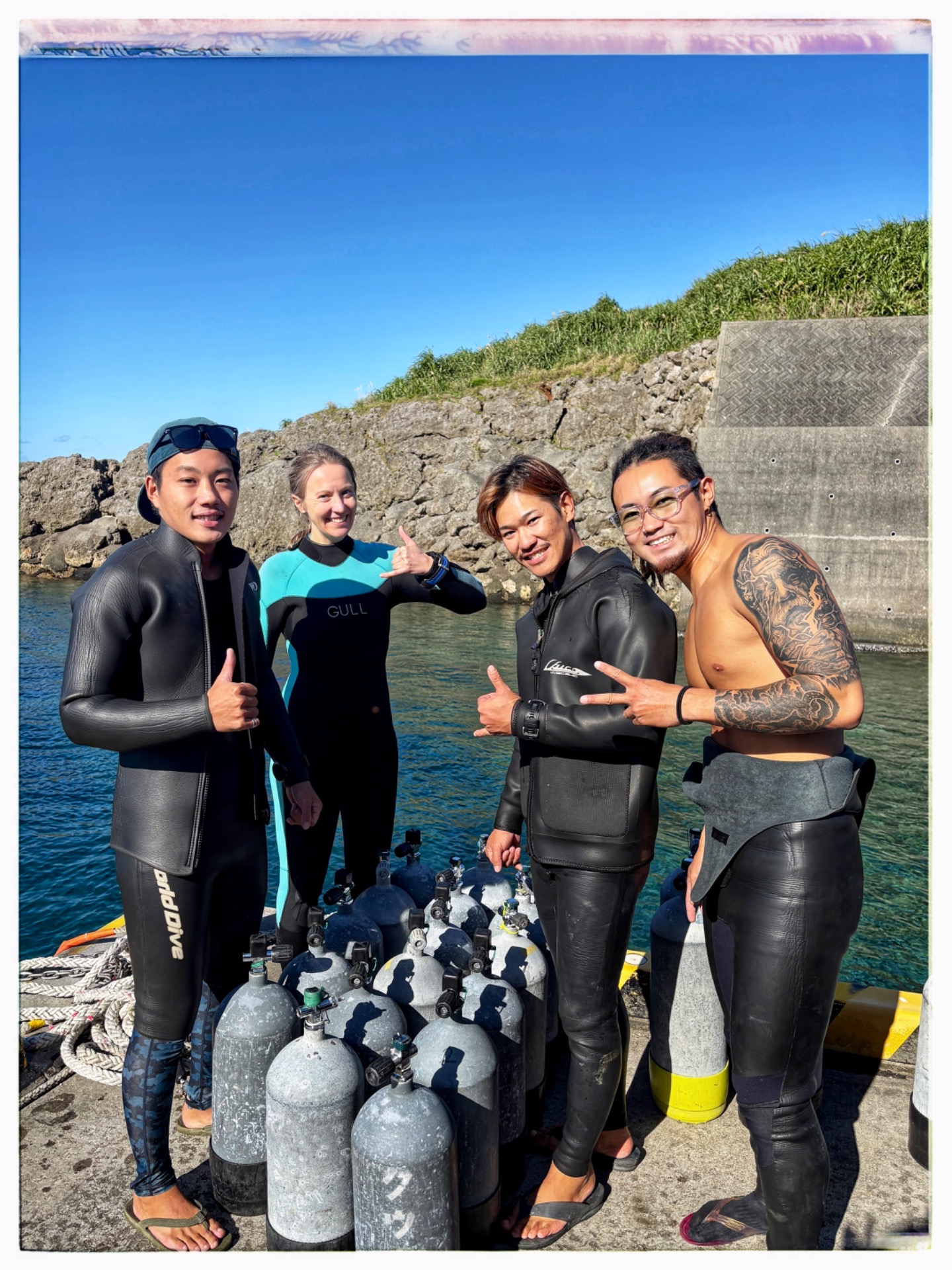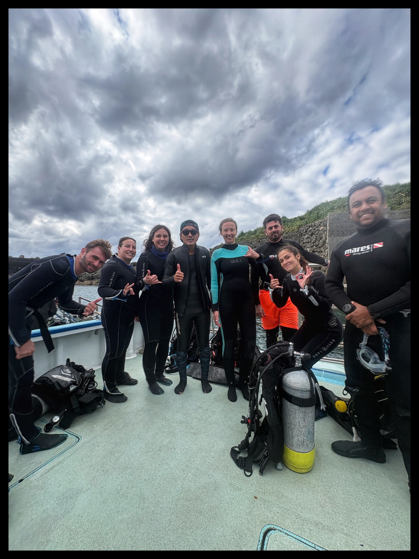 We picked up another diver. Apart from me, today's team and the entire dive school consisted only of Japanese men and women. Of course, I didn't understand a single word, not even the briefing. Luckily, Saya came over to me and explained it in English—at least she tried. But overall, I understood everything. She also brought me a 7 mm wetsuit, and then we set off for the harbor.