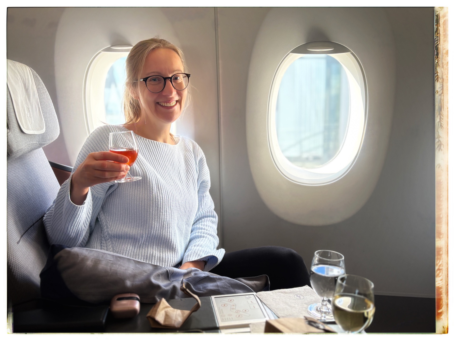 The plane took off half an hour late. I enjoyed the flight in business class, which I was able to afford thanks to my frequent flyer miles, and arrived in Munich feeling relaxed.